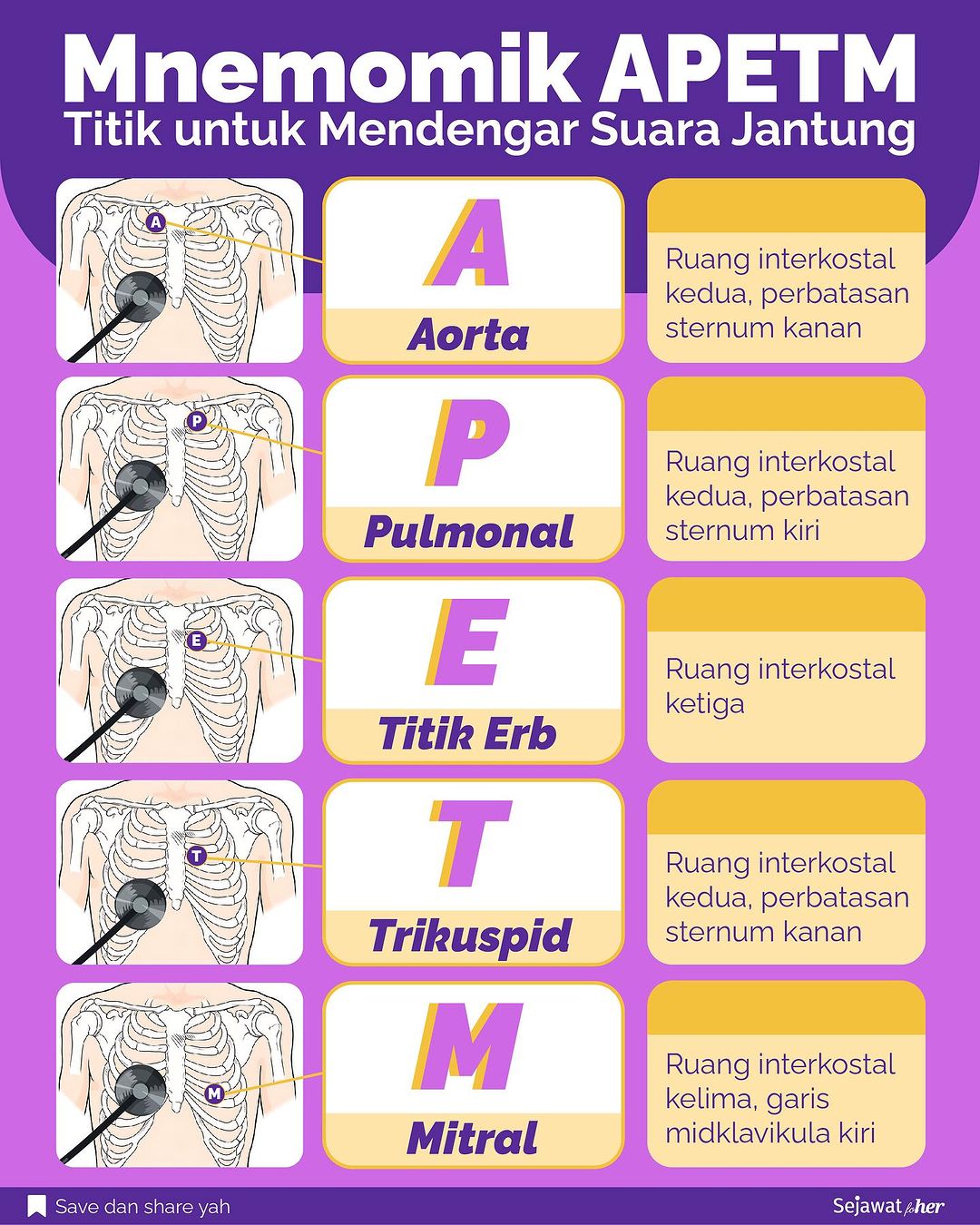 Menggunakan stetoskop memang hal yang penting dalam pemeriksaan jantung. Tapi, gak bisa ditaruh sembarangan loh. Ada titik-titik tertentu yang akan memudahkanmu mendengar lebih jelas, dan lebih dikenal sebagai mnemonik APETM. Apa saja titiknya? Yuk simak!